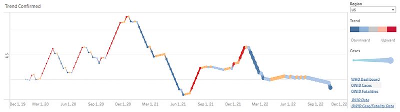 A line graph tracking the rise and fall of confirmed COVID cases in the United States over time