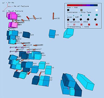 A multivariate visualization of CPU chips that varies 2D position plus hue, luminance, size, orientation, and transparency to encode five separate chip properties